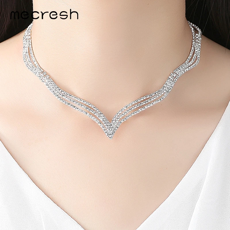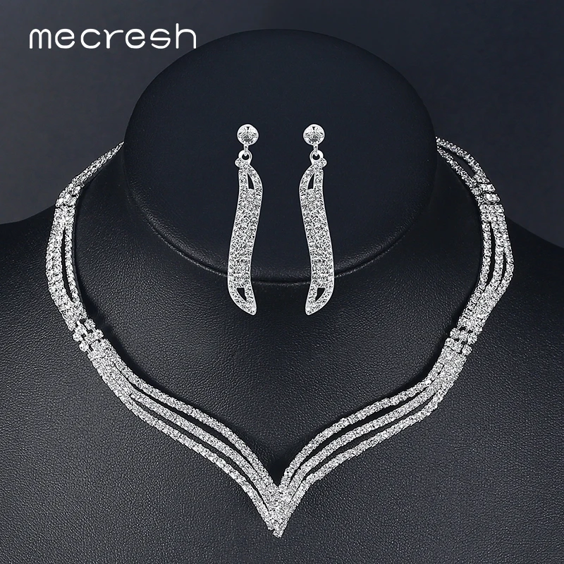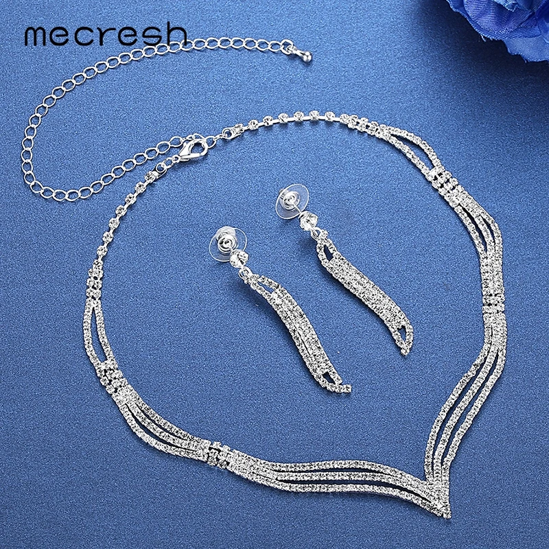 low cost Mecresh Simple Crystal Bridal Jewelry Sets Silver Color Rhinestone Earrings Necklace Sets for Women
